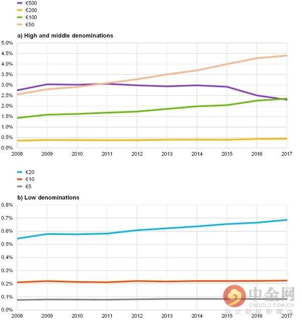 (流通中不同面值欧元纸币占名义GDP的比重)