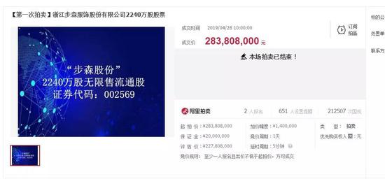 从三天前的4月27日10时起,浙江步森服饰股份有限公司(下称步森股份)2240万股股票无限流通股被司法拍卖,4月28日10时30分,据“阿里拍卖·司法”网站显示,用户姓名杜欣通过竞买号X5689以成交价2.84亿元竞拍成功.