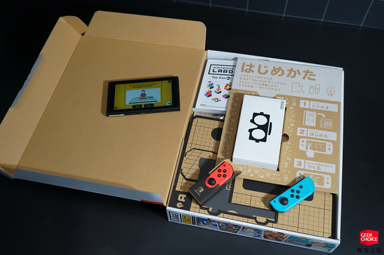 开箱 Labo VR 的体验和极客之选去年开箱 Labo Robot Kit 的感觉非常相似。在一箱沉重的纸盒当中,任天堂一如既往塞进了一叠厚厚的纸板、一袋包括橡皮筋、贴纸在内的辅助用品,以及一盒游戏卡,作为 Labo 不可或缺的组成部分,想象它们在自己手上从原材料变成成品,首先会给人一种期待。当然,如何在一块只有 720P 分辨率屏幕上表现出 VR 的好玩属性,这一点也是让人好奇的。