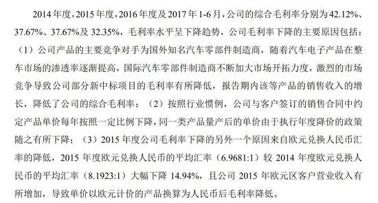 自2014年以来,科博达毛利率逐年下降,到2017年跌至谷底32.82%。对此,公司2017年12月报送招股书(以下简称“2017版招股书”)中的解释如下: