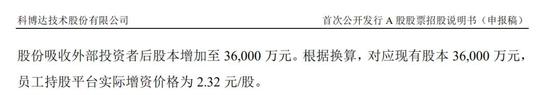 2016 年 12 月,嘉兴富捷、嘉兴赢日、嘉兴鼎韬作为员工持股平台,以 5.86 元/注册资本的价格增资入股科博达前身科博达有限。2017 年 6 月,科博达有限整体变更设立为科博达股份;同月,科博达股份吸收外部投资者后注册资本增加至 3.6亿元。招股书称,“根据换算,员工持股平台实际增资价格为 2.32 元/股”。