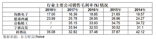 一个强有力的证据是,尽管科博达2018年毛利率仍显著高于行业龙头,就其自身而言,综合毛利率已从2014年的42.12%降至2017年的32.82%,降幅近10个百分点。相比之下,行业其他上市公司毛利率并未出现如此巨大波动。