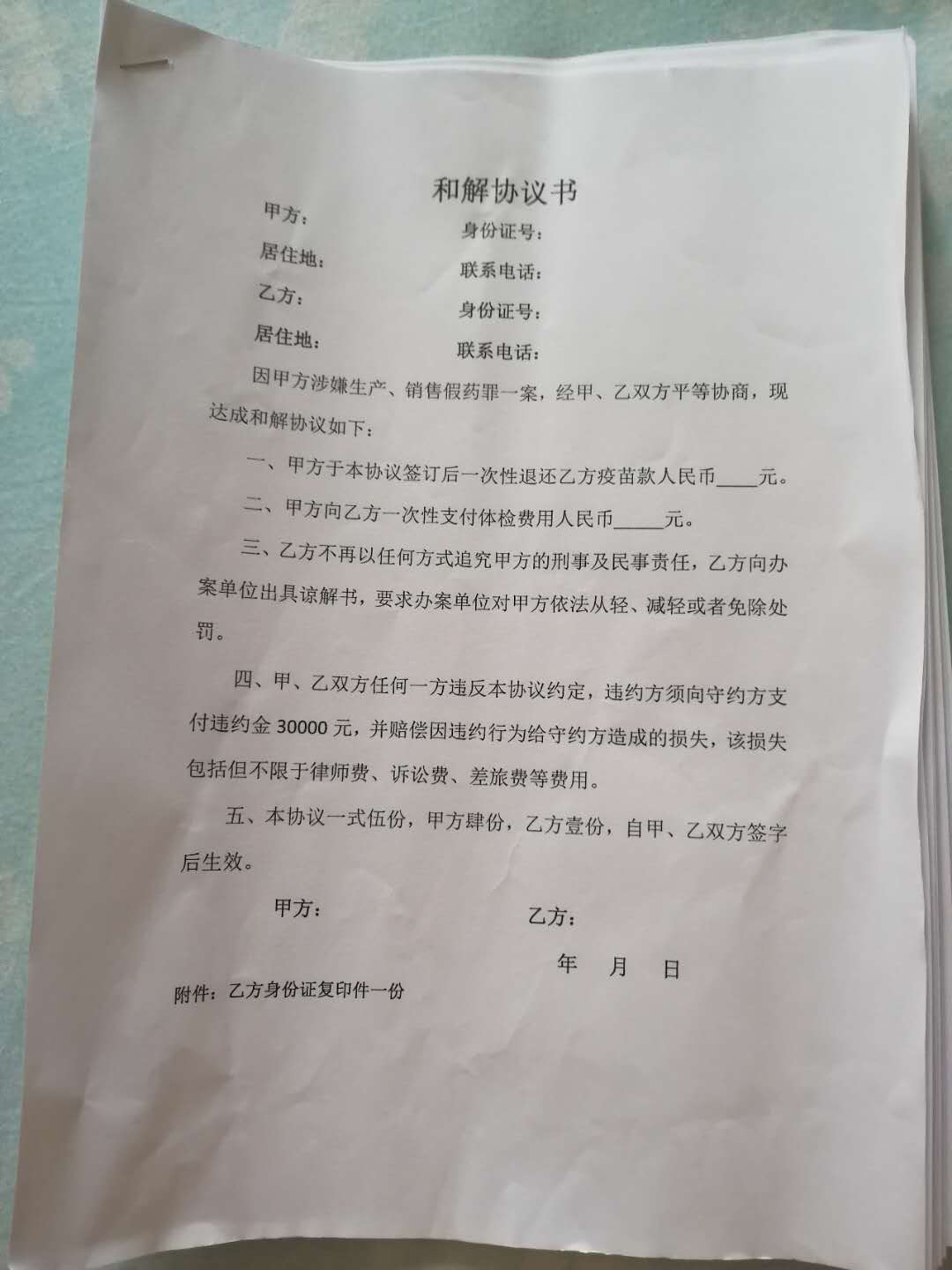 4月29日,多位该批涉假疫苗的女性接种者向澎湃新闻(www.thepaper.cn)提供了一份《和解协议书》。多位接种者告诉澎湃新闻,4月17日,涉事“医务人员”王丽娜曾约见接种者,以“退回9000元接种费用,赔付1500元体检费用”为条件,希望求得和解。