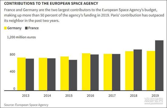 值得一提,包括德国、法国在内的欧洲18个国家每年还会向欧洲航天局(ESA)投入一笔预算,而德国向ESA的投资已经连续2年低于法国。