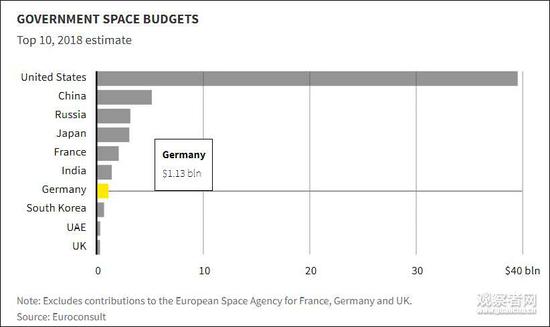 法国咨询机构Euroconsult数据显示,德国2018年投入到本国航天领域的预算仅约11.3亿美元,排名全球第七,落后于印度,是邻国法国的一半,约为美国的3%。