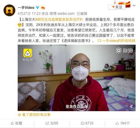 去年从上海交大研究生毕业的张迪,白血病复发后选择放弃治疗。他说,拒绝低质量生存,要平静地走……