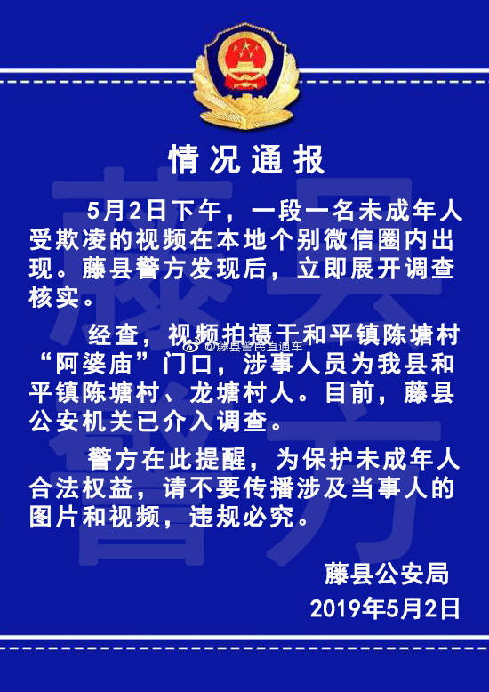 5月2日下午,一段一名未成年人受欺凌的视频在本地个别微信圈内出现。藤县警方发现后,立即对该事件展开调查核实。