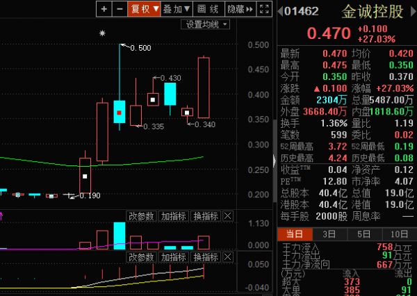 特别值得一提的是,自4月15日起,自诩“港股唯一特色小镇概念股”金诚控股连日来放量大涨。774万港元、2595万港元、4813万港元、2304万港元……,成交额从原先的每日仅几十万港元到千万级别的跃升。不到8个交易日,股价近乎翻三番。截至4月26日收盘,报0.47港元,总市值19亿港元。