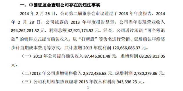 经查,大智慧通过承诺“可全额退款”的销售方式提前确认收入,以“打新股”等为名进行营销、延后确认年终奖少计当期成本费用等方式,共计虚增2013年度利润1.21亿元,占当年对外披露的合并利润总额的281%。