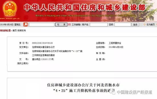住房和城乡建设部关于衡水“4·25”施工升降机坠落事故的通报