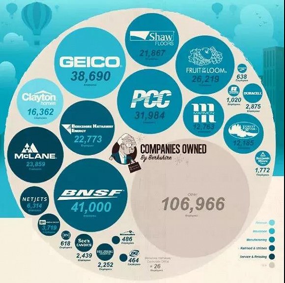 数据可视化网站Visual Capitaland和个人融资网站Finder提供了巴菲特商业“帝国”中一些公司的相关信息,这两个网站创制了一份巴菲特帝国的庞大信息图,如下图所示:
