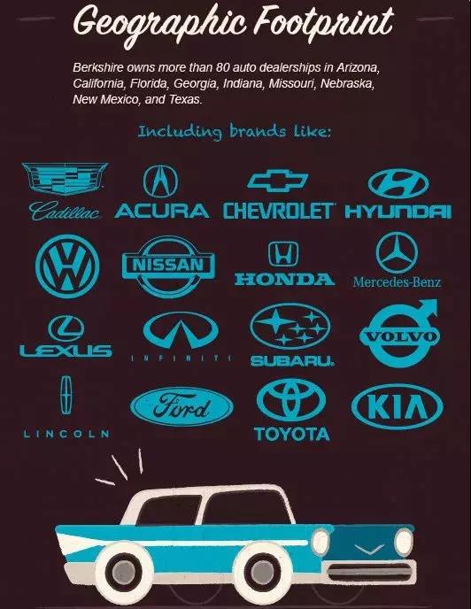 此外,伯克希尔哈撒韦还在全美范围内拥有80多家汽车经销商,这些经销商代理的汽车品牌包括福特(NYSE:F)、丰田(NYSE:TM)和梅赛德斯奔驰等。