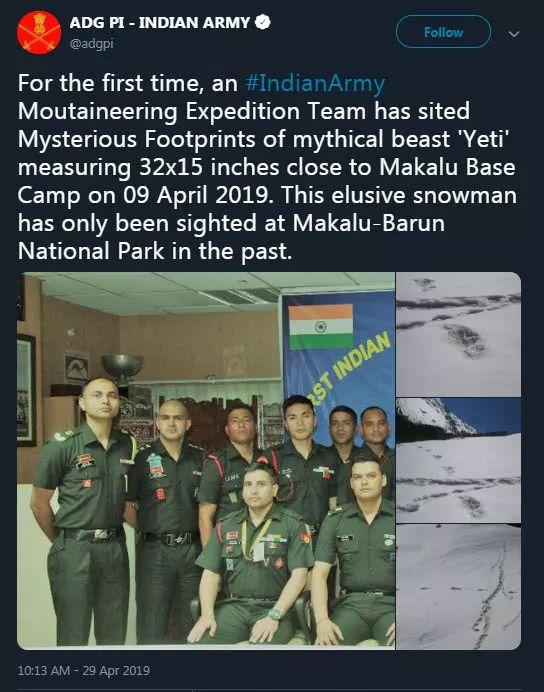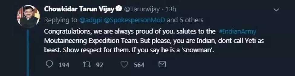 “恭喜,我们印度人为你自豪。向印度军队登山探险队致敬。但你是个印度人,别叫它‘怪物’,应该叫‘雪怪’。”
