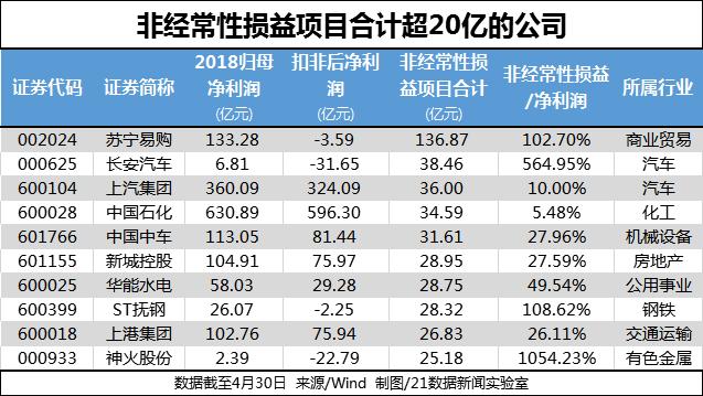 具体来看,非经常性损益项目合计超过20亿元的公司有10家,苏宁易购最高,达136.87亿元,是第二名的3.6倍。苏宁易购(002024.SZ)2018年实现归属母公司净利润133.28亿元,同比增长216.38%,然而扣除非经常性损益后,净利润转为亏损3.59亿元,同比下滑306.65%。