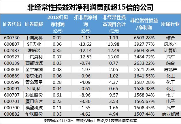 数据显示,实现盈利的上市公司中,30%以上净利润来自非经常损益项目的公司有892家,超过50%的有588家。非经常性损益对净利润贡献超15倍的公司有13家,其中,中国高科的非经项目贡献率最高,同时也靠非经项目实现扭亏,扣费后净利润为-1.17亿元。