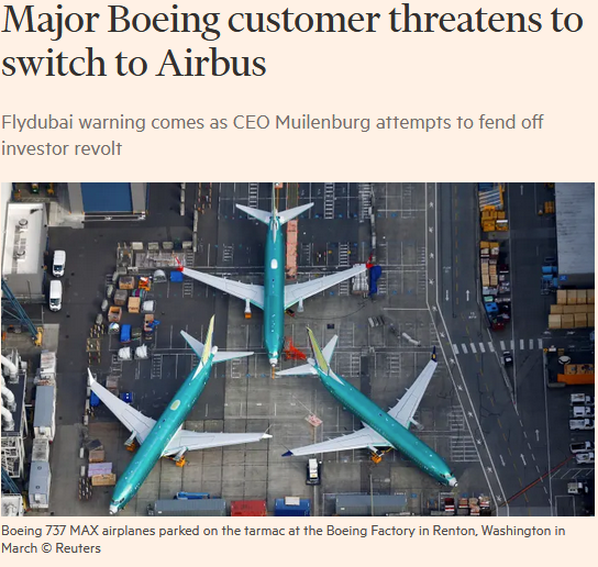 2、FT头条 | 波音主要大客户威胁转向空客 CEO坚称737设计很安全