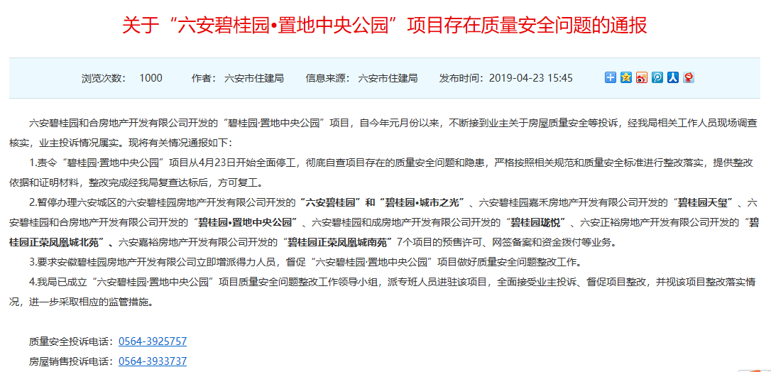 据安徽省六安市住房和城乡建设局消息,六安碧桂园和合房地产开发有限公司开发的“碧桂园·置地中央公园”项目,自今年元月份以来,不断接到业主关于房屋质量安全等投诉,经我局相关工作人员现场调查核实,业主投诉情况属实。