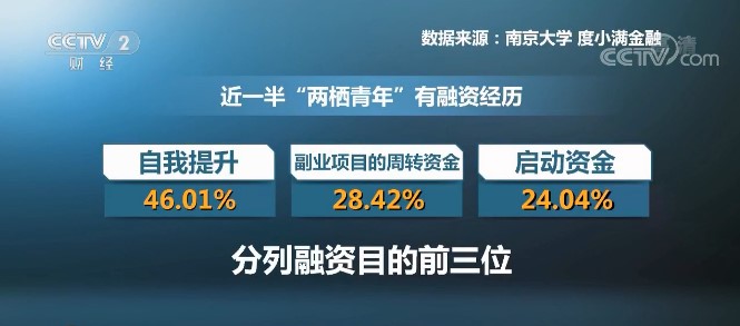 数据还显示,“两栖青年”乐于创业,近一半的人有过融资的经历,自我提升、副业项目的周转资金和启动资金分列融资目的前三位。在融资渠道上,互联网融资占比明显上升,以蚂蚁借呗、微粒贷、有钱花为代表的BAT网络小额信贷产品是首选。