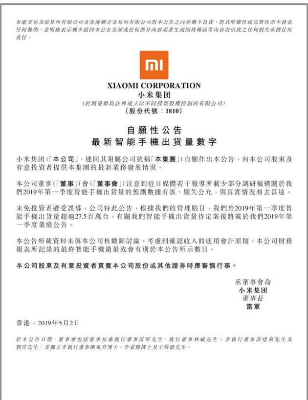 昨晚,小米集团发布公告称,2019年第一季度,公司智能手机出货量超过2750万台。小米在公告中称,部分调研机构关于我们2019年第一季度智能手机出货量的预测数据有误、显失公允,与真实情况相去甚远。未免投资者遭受误导,公司特此公告,根据我们的管理账目,我们于2019年第一季度智能手机出货量超过2750万台。